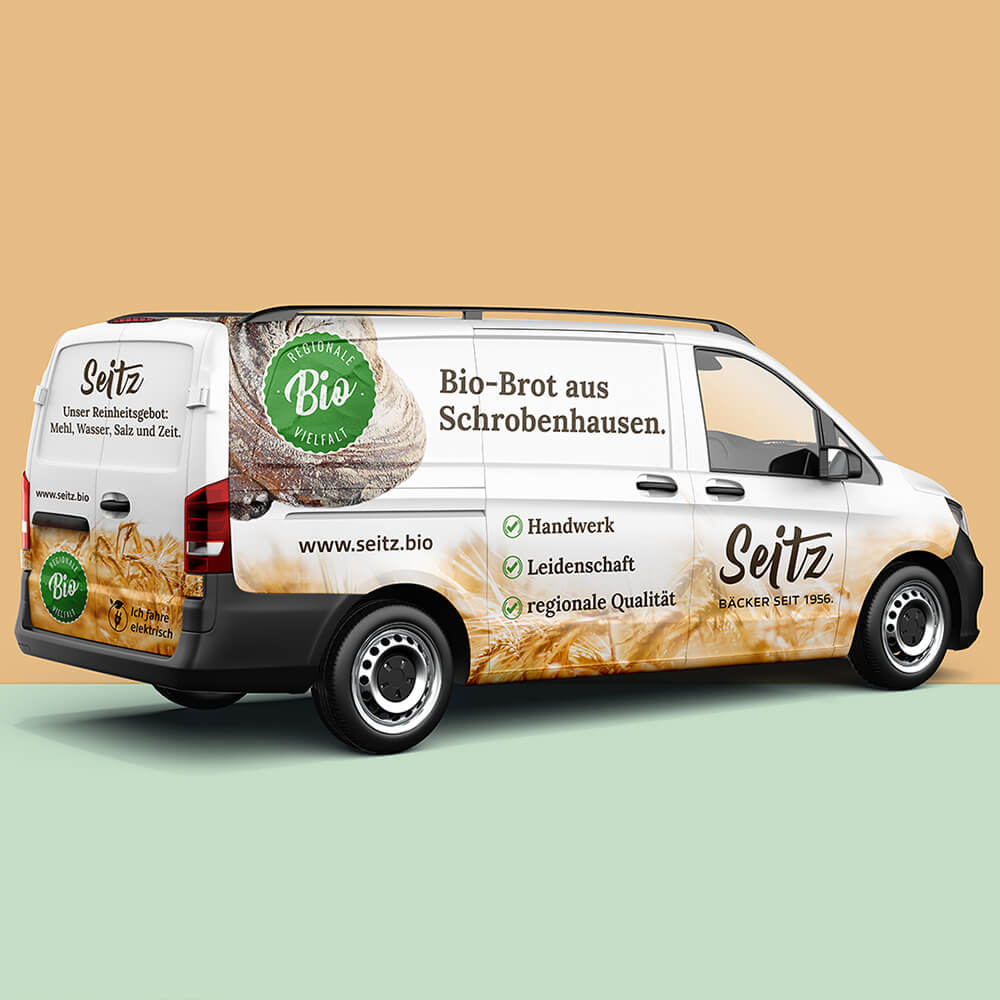 Neben einer unverwechselbaren Wort-Bild-Marke mit hohem Wiedererkennungswert haben wir verschiedene Drucksachen wie Bäckertüten, Plakate, Kundenkarten und Flyer gestaltet, um die Kundenbindung zu stärken. Darüber hinaus haben wir die Fahrzeugbeschriftungen für die gesamte Flotte entworfen, um eine konsistente Markenpräsenz zu gewährleisten.