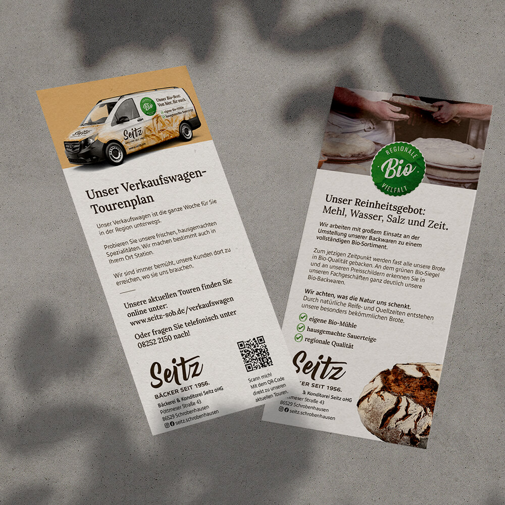 Die Marketingkonzeption und Gestaltung zieht sich quer durch alle wichtigen Kommunikationsmittel. Klassische Drucksachen wie Bäckertüten, Etiketten, Kundenkarten, Plakate sowie Fahrzeug- und Fassadenbeschriftung bis hin zur umfangreichen Website mit aufwändigen Produktfotografien und einem starken Social-Media-Auftritt – eben eine Rundumbetreuung aus einer Hand.