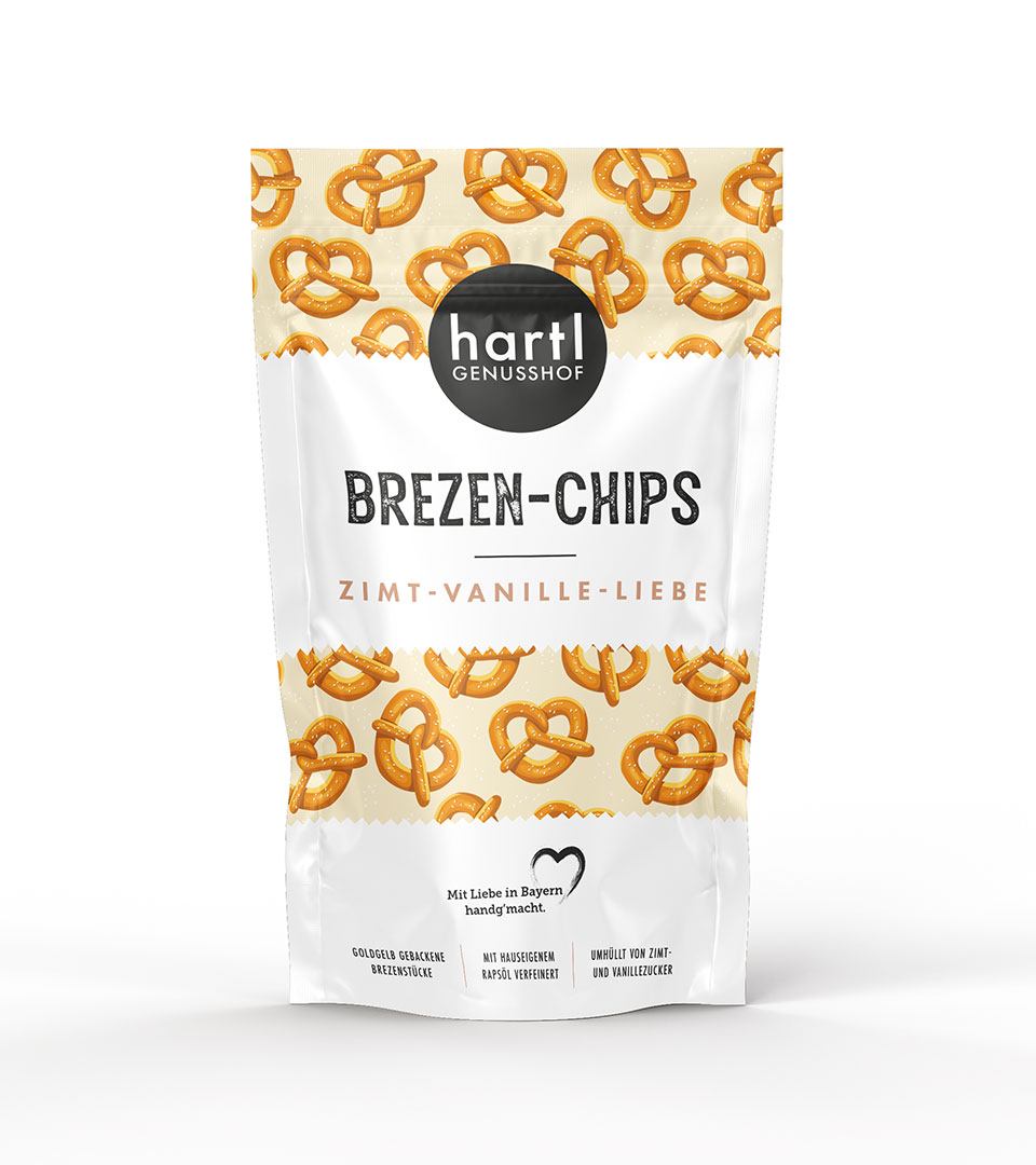 Zur Einführung der neuen Produktlinie „Brezen-Chips“ entwickelten wir ein Verpackungsdesign das modern und selbstbewusst ist und sich dabei von den Produkten der Konkurrenz abhebt – ohne dabei die Markenidentität zu vernachlässigen.