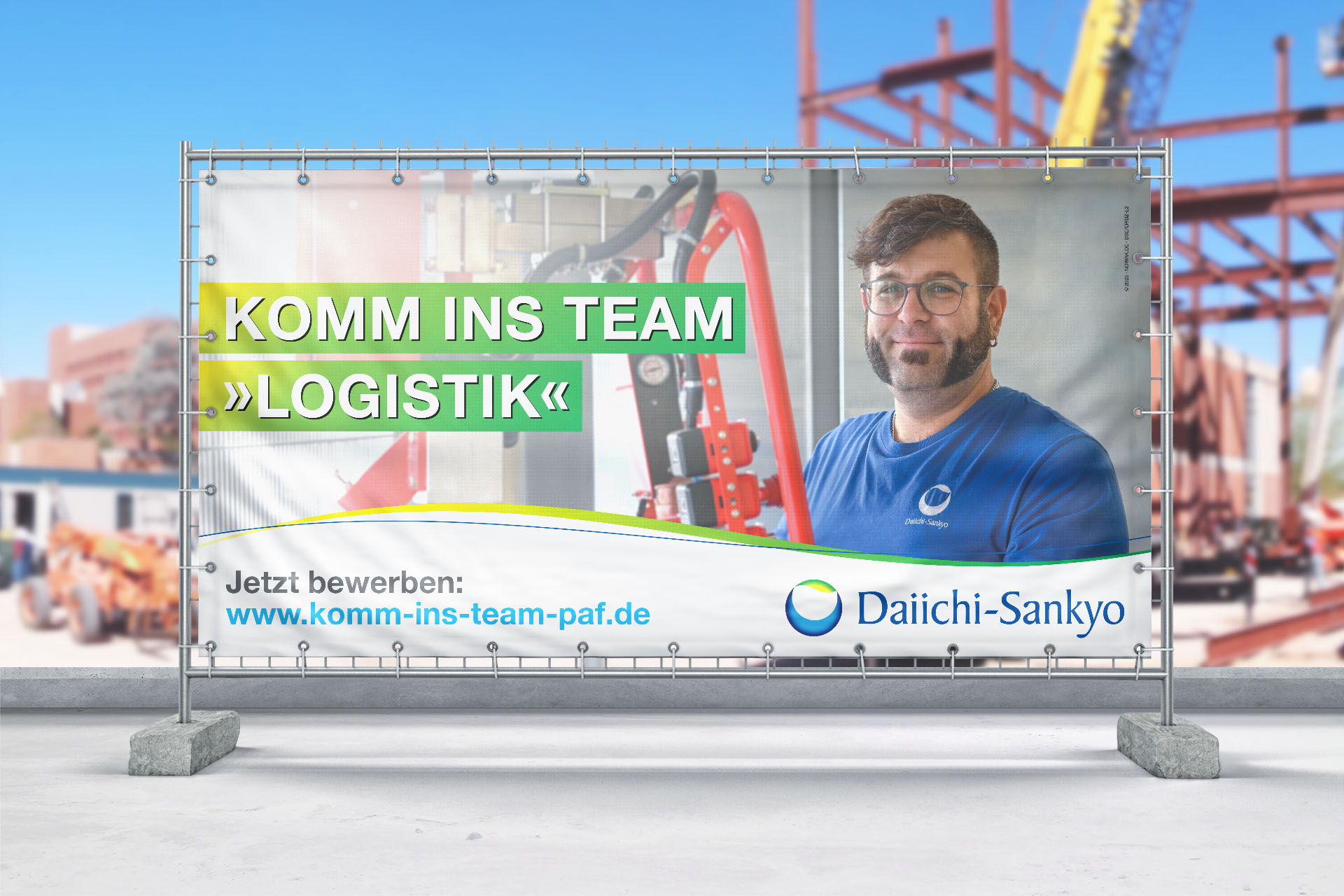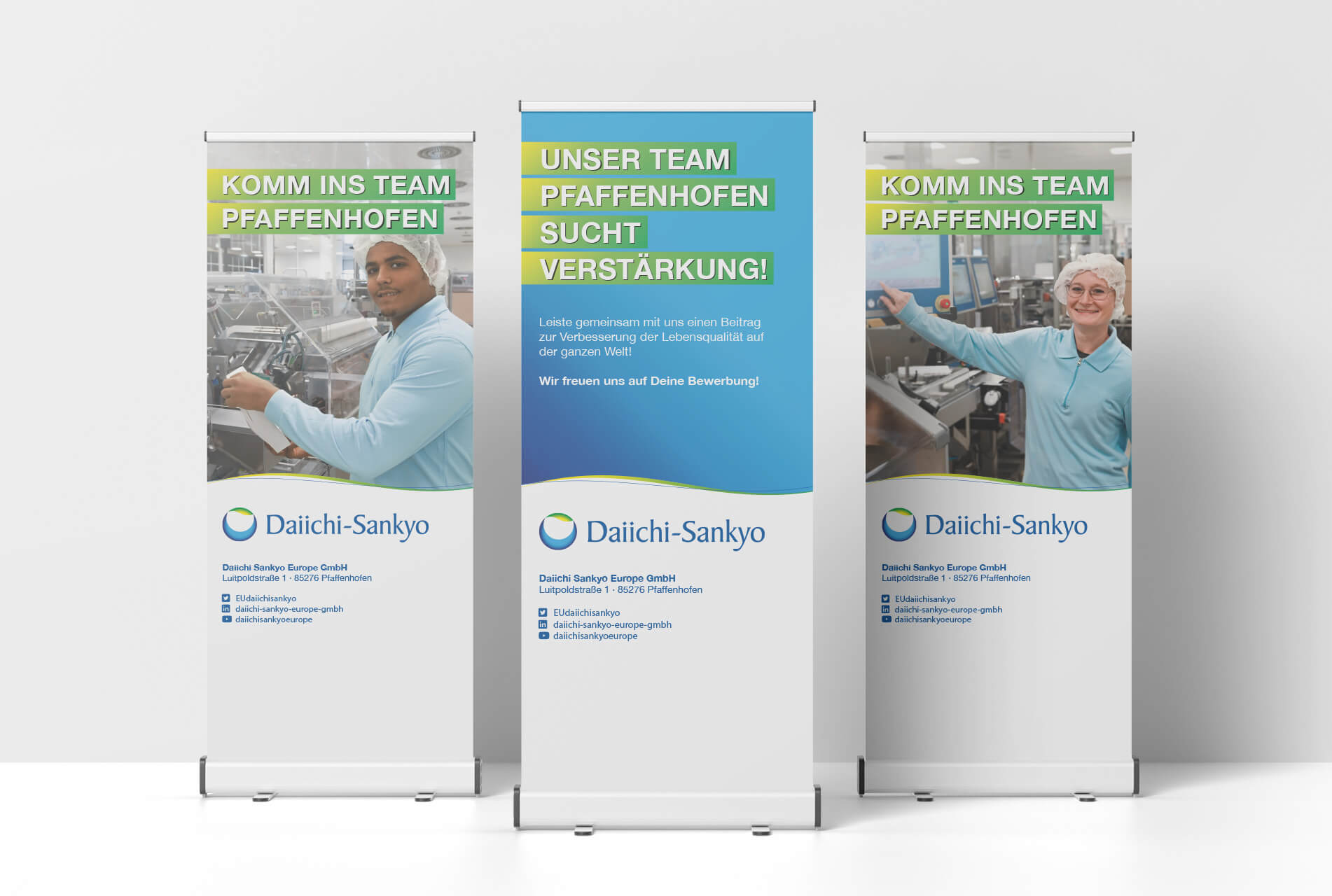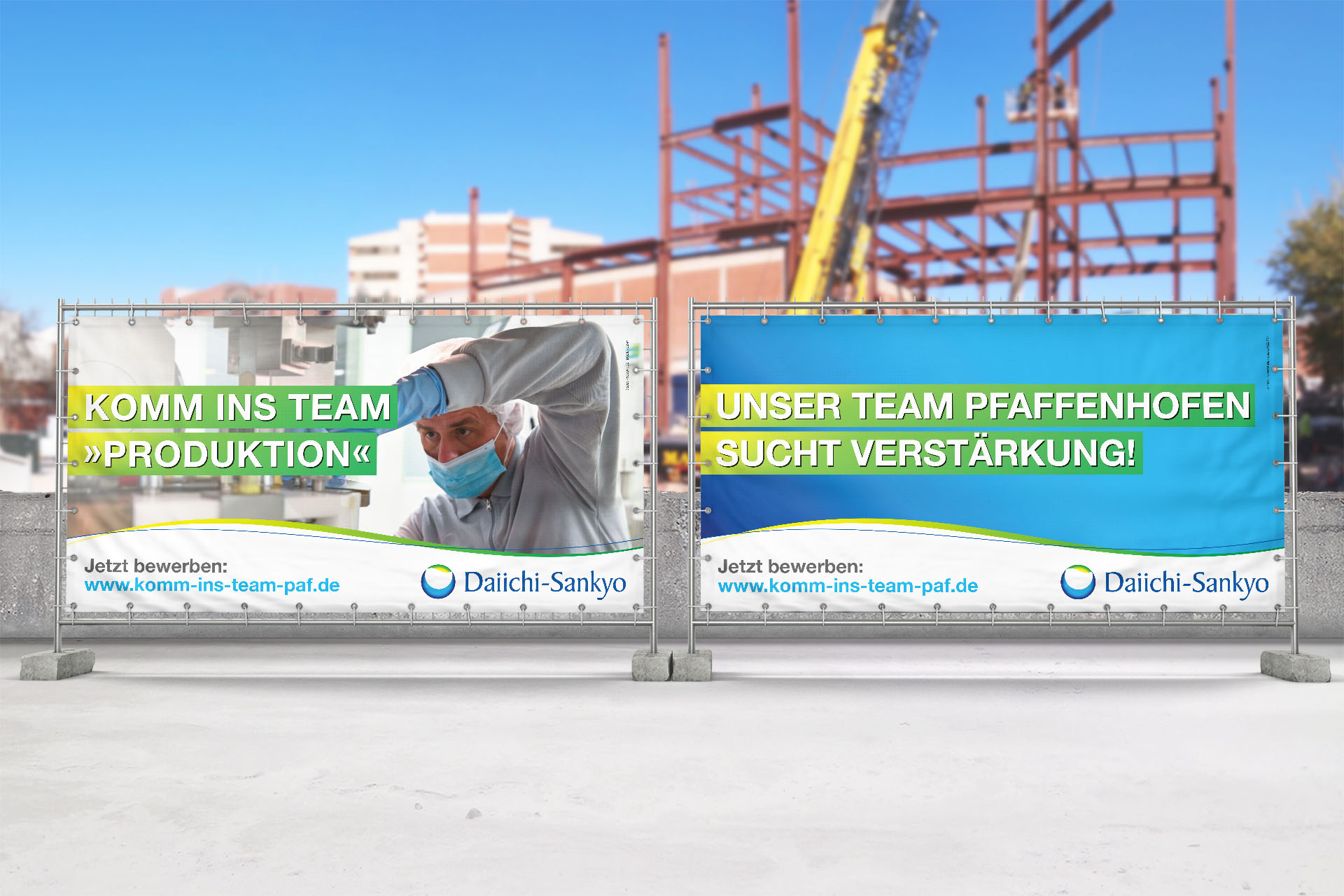 Als professionelle Werbe- und Marketingagentur haben wir für Daiichi Sankyo Europe GmbH in Pfaffenhofen eine maßgeschneiderte Strategie für die Entwicklung einer lokalen Arbeitgebermarke umgesetzt. Dazu gehörten authentische Mitarbeiterfotos, gezielte Anzeigen in Fachmagazinen und Tageszeitungen, kreative Bauzaunbanner an stark frequentierten Straßen und ansprechende Roll-Up Banner für Recruiting-Messen.