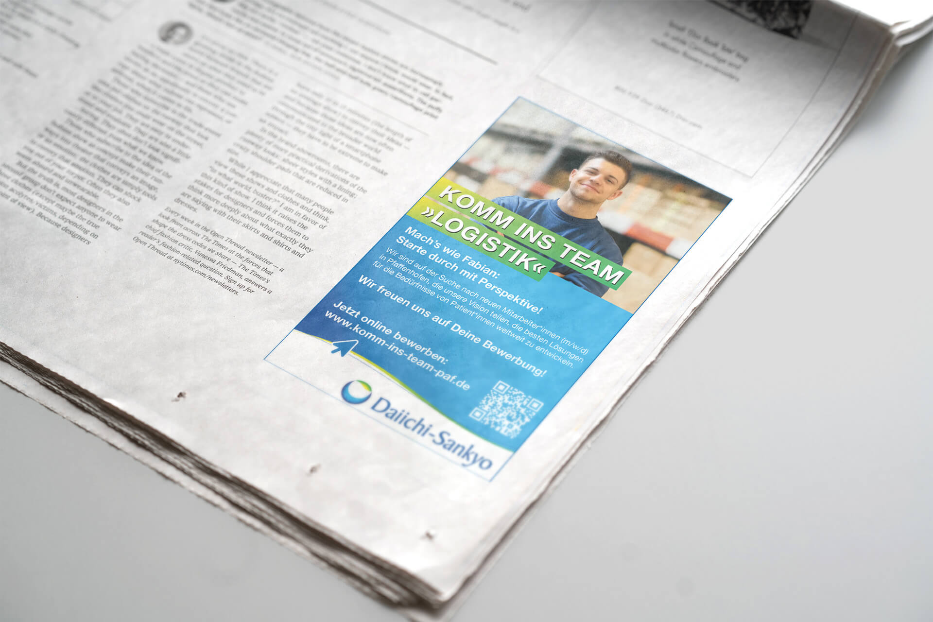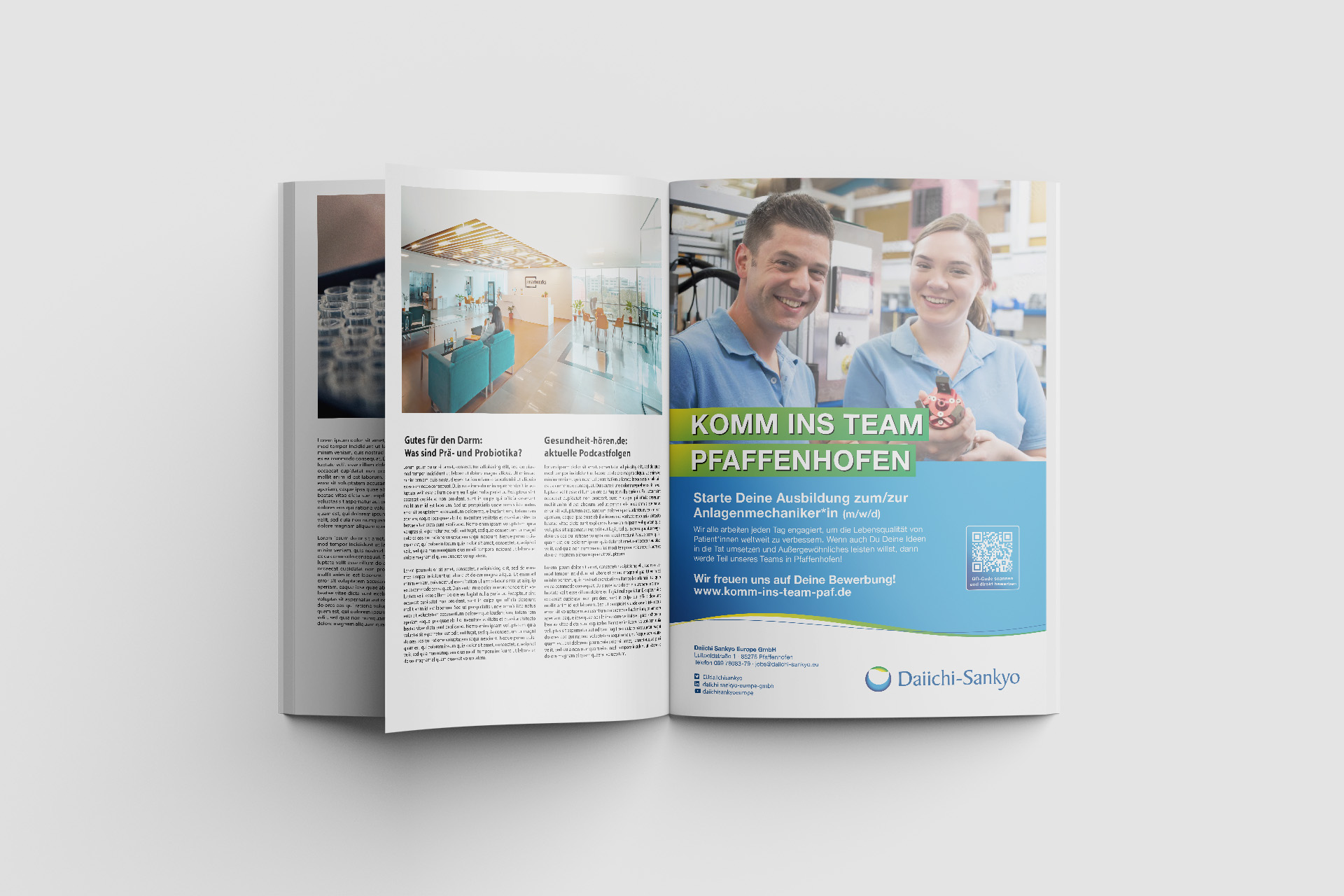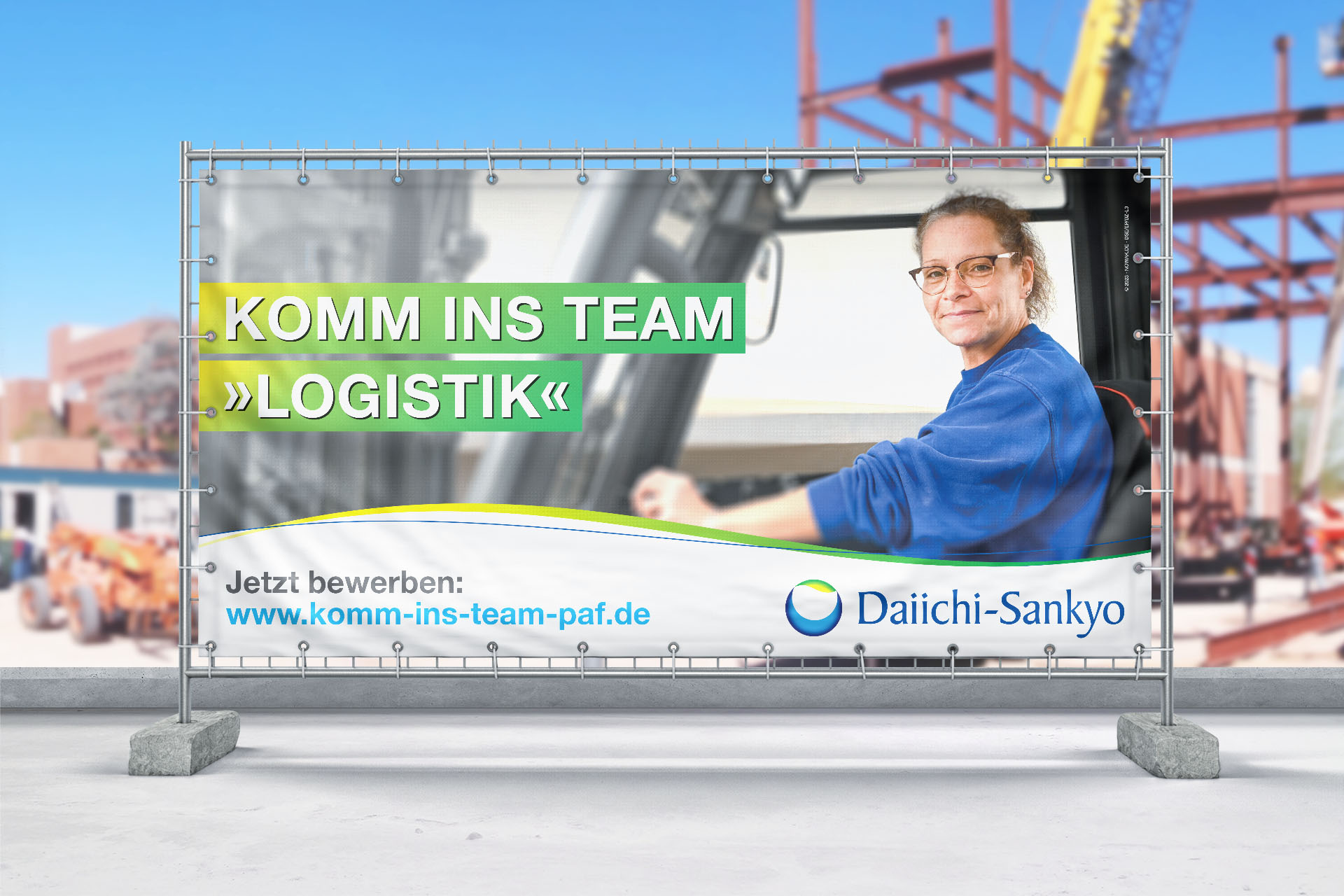 Als professionelle Werbe- und Marketingagentur haben wir für Daiichi Sankyo Europe GmbH in Pfaffenhofen eine maßgeschneiderte Strategie für die Entwicklung einer lokalen Arbeitgebermarke umgesetzt. Dazu gehörten authentische Mitarbeiterfotos, gezielte Anzeigen in Fachmagazinen und Tageszeitungen, kreative Bauzaunbanner an stark frequentierten Straßen und ansprechende Roll-Up Banner für Recruiting-Messen.